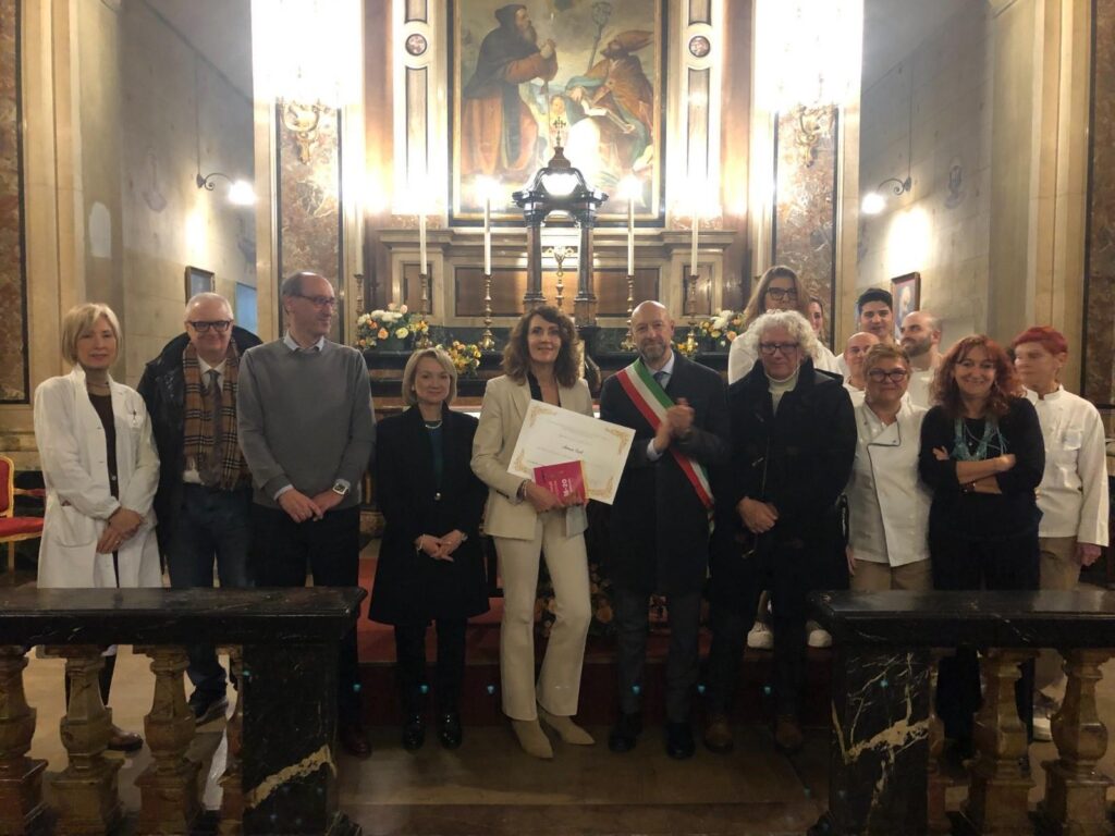 Mariateresa Buttigliengo, Direttrice Generale di Amos s.c.r.l., accompagnata dalla Responsabile del Servizio Ristorazione di Alessandria, Cristina Pronzato e da tutta la brigata di cucina, ha ricevuto un attestato che esprime la massima gratitudine alla Società per aver contribuito a migliorare la qualità delle cure offerte ai pazienti.