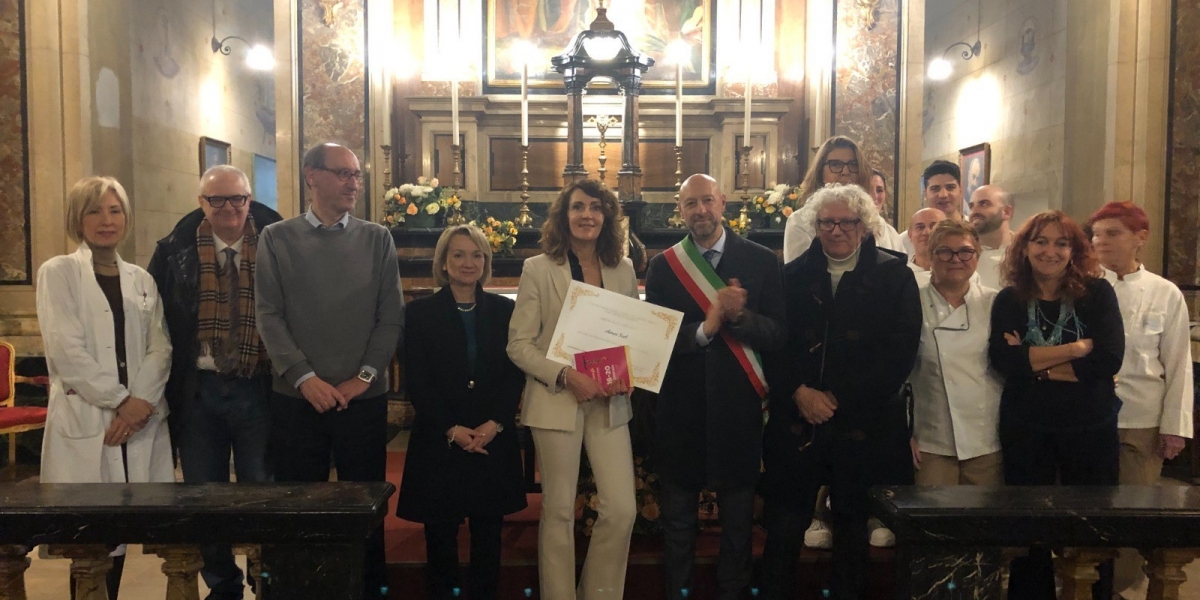 Mariateresa Buttigliengo, Direttrice Generale di Amos s.c.r.l., accompagnata dalla Responsabile del Servizio Ristorazione di Alessandria, Cristina Pronzato e da tutta la brigata di cucina, ha ricevuto un attestato che esprime la massima gratitudine alla Società per aver contribuito a migliorare la qualità delle cure offerte ai pazienti.